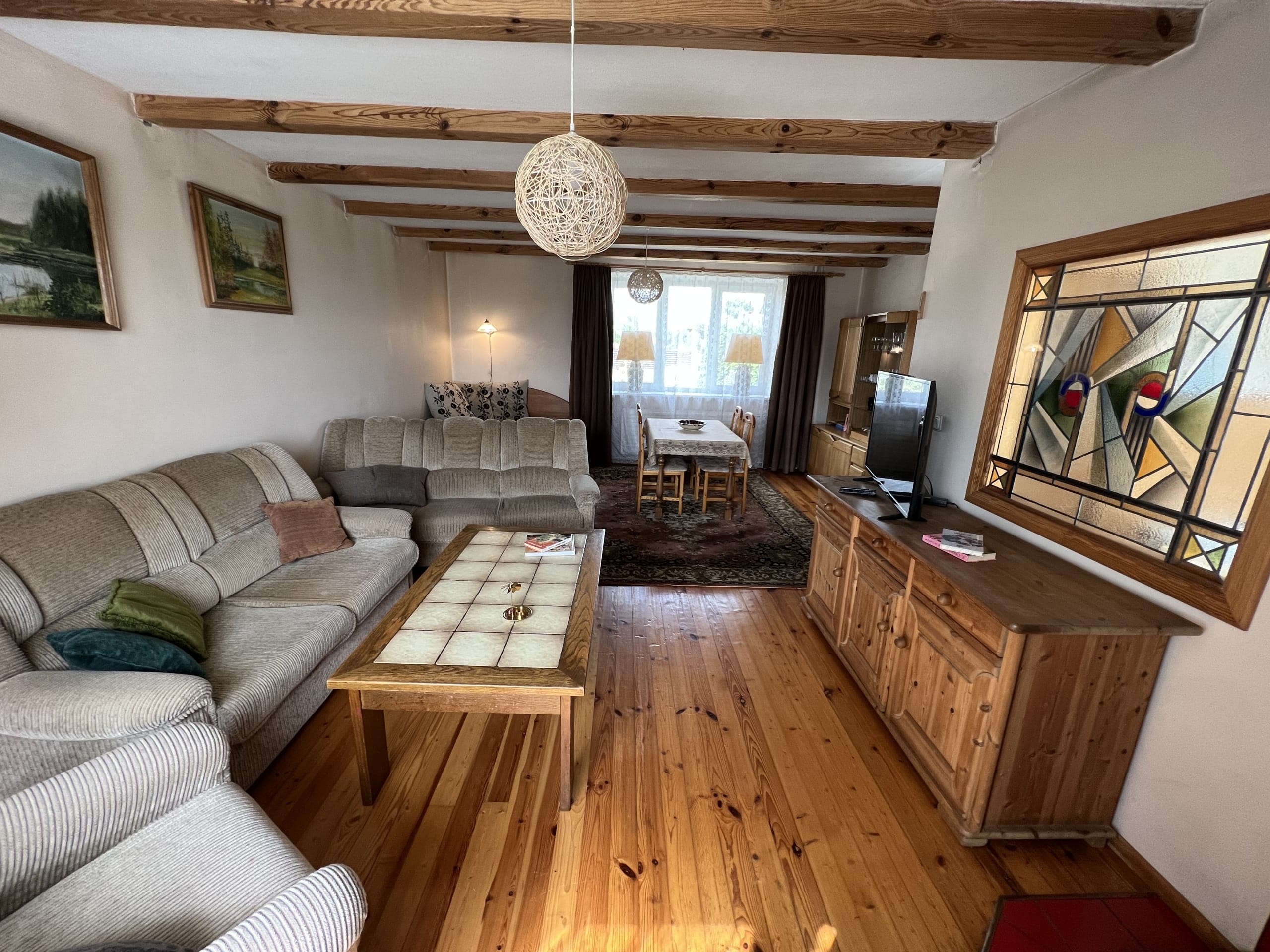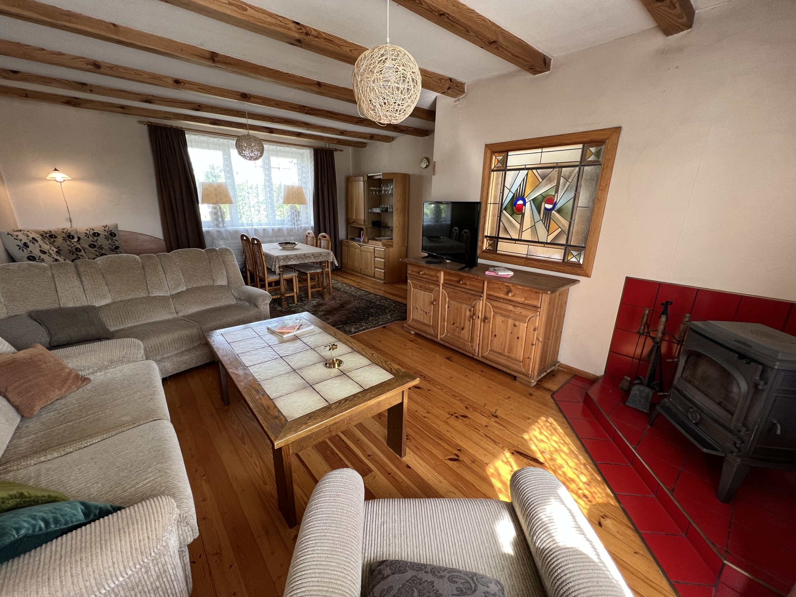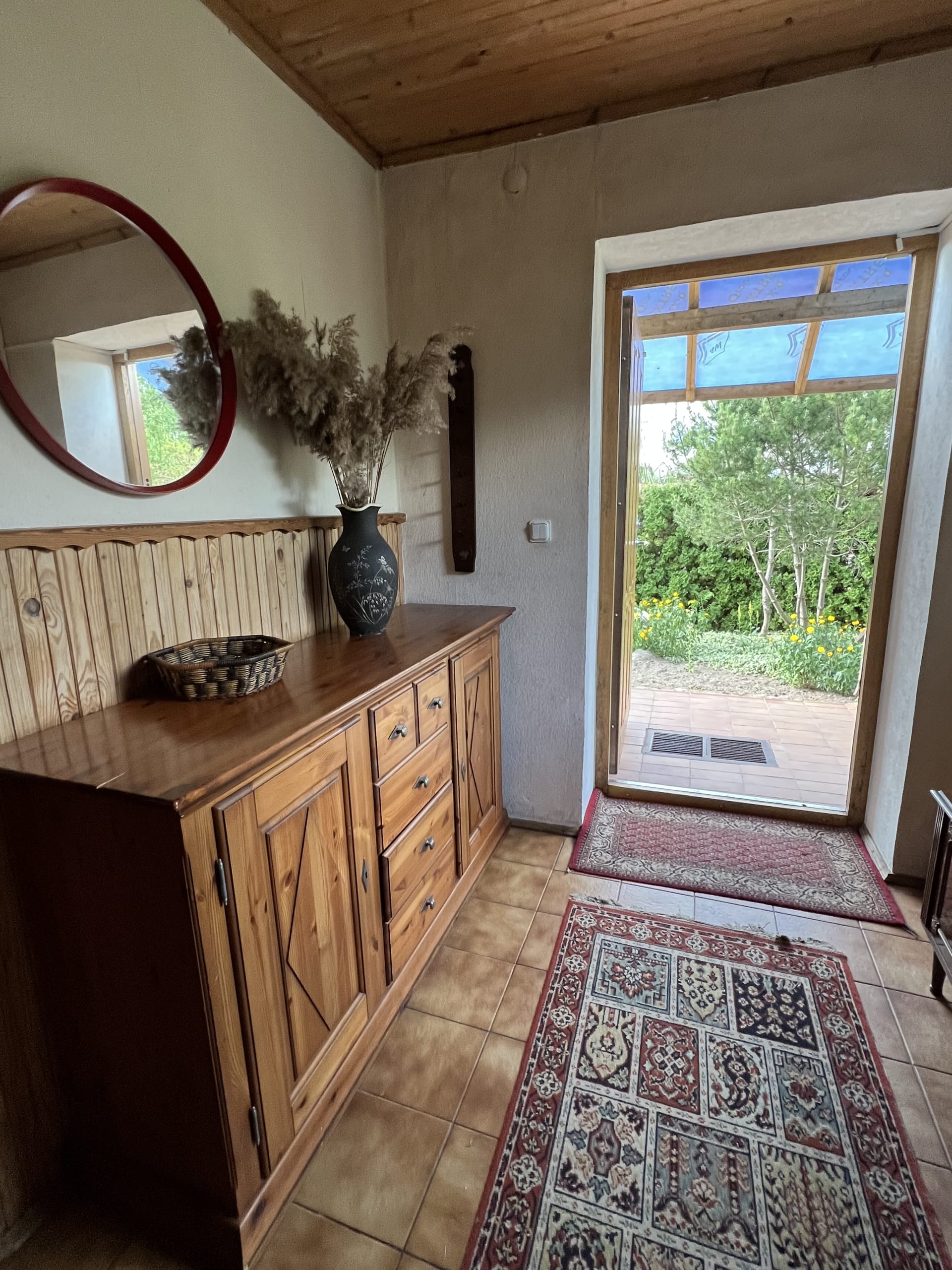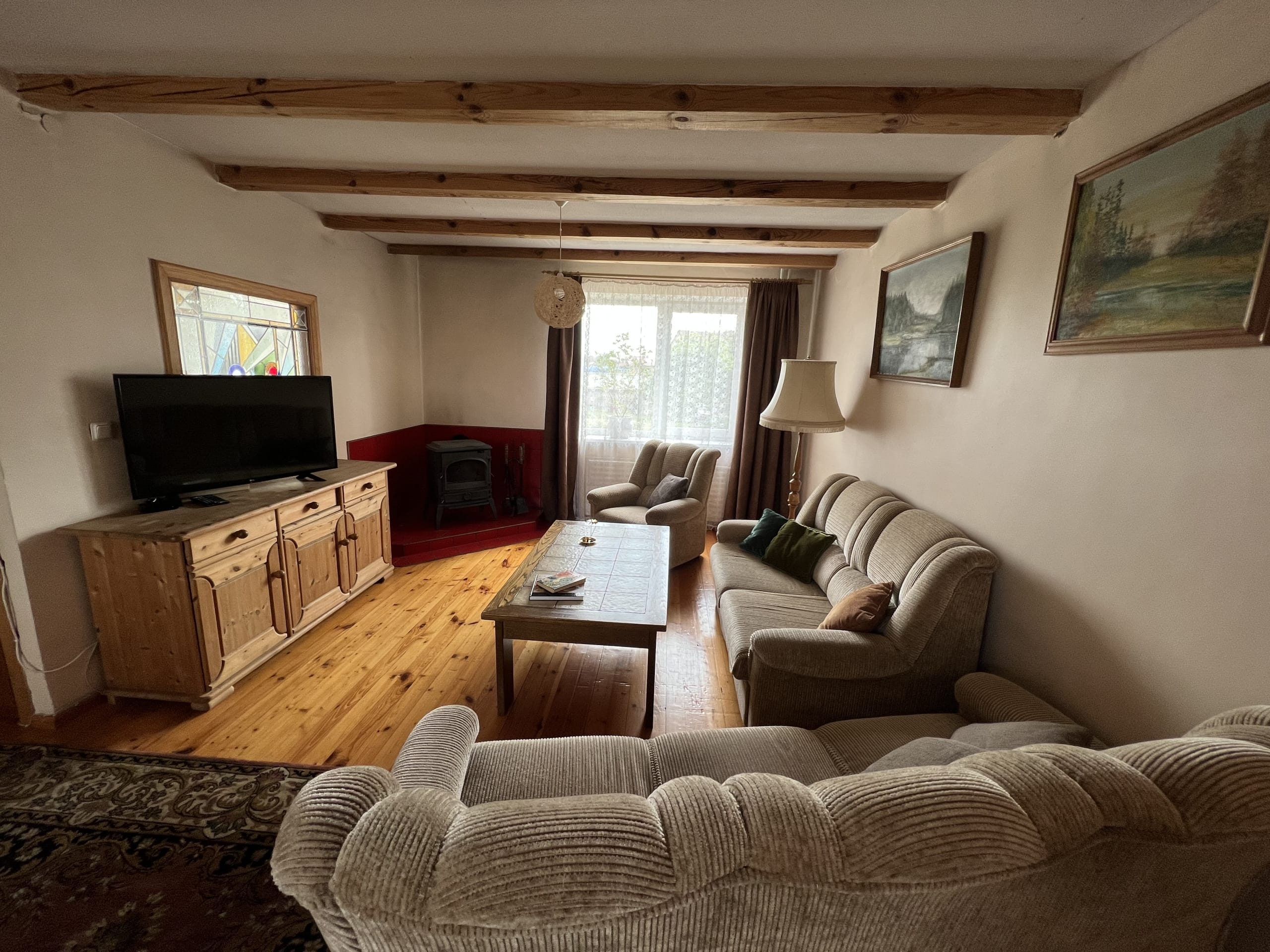* Pirmas aukštas – virtuvėje ir vonioje su WC – plytelės, svetainėje medinės grindys ir kambariuose -kiliminė danga.