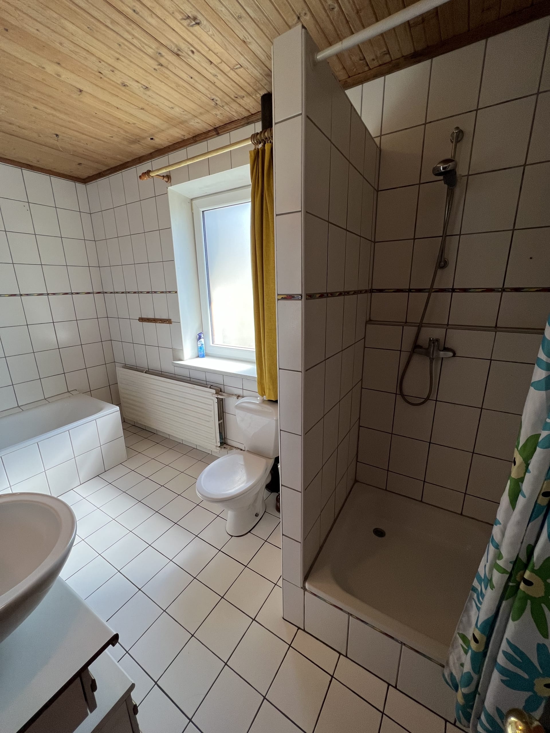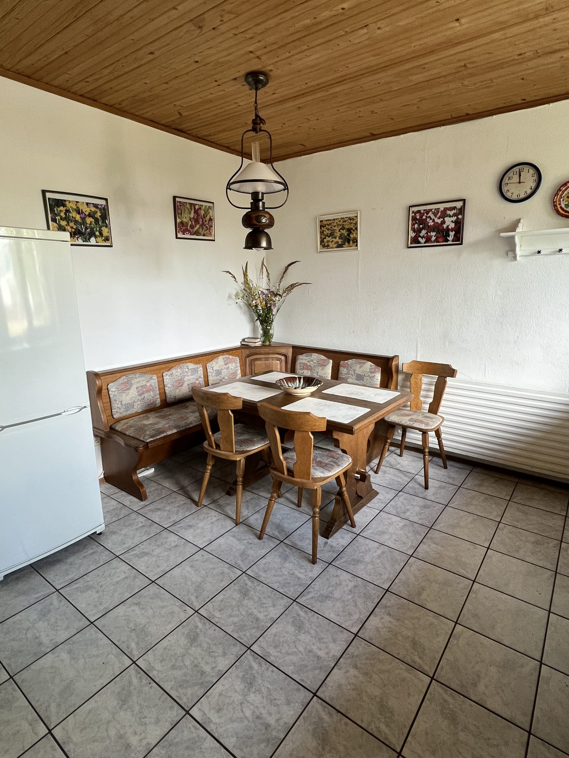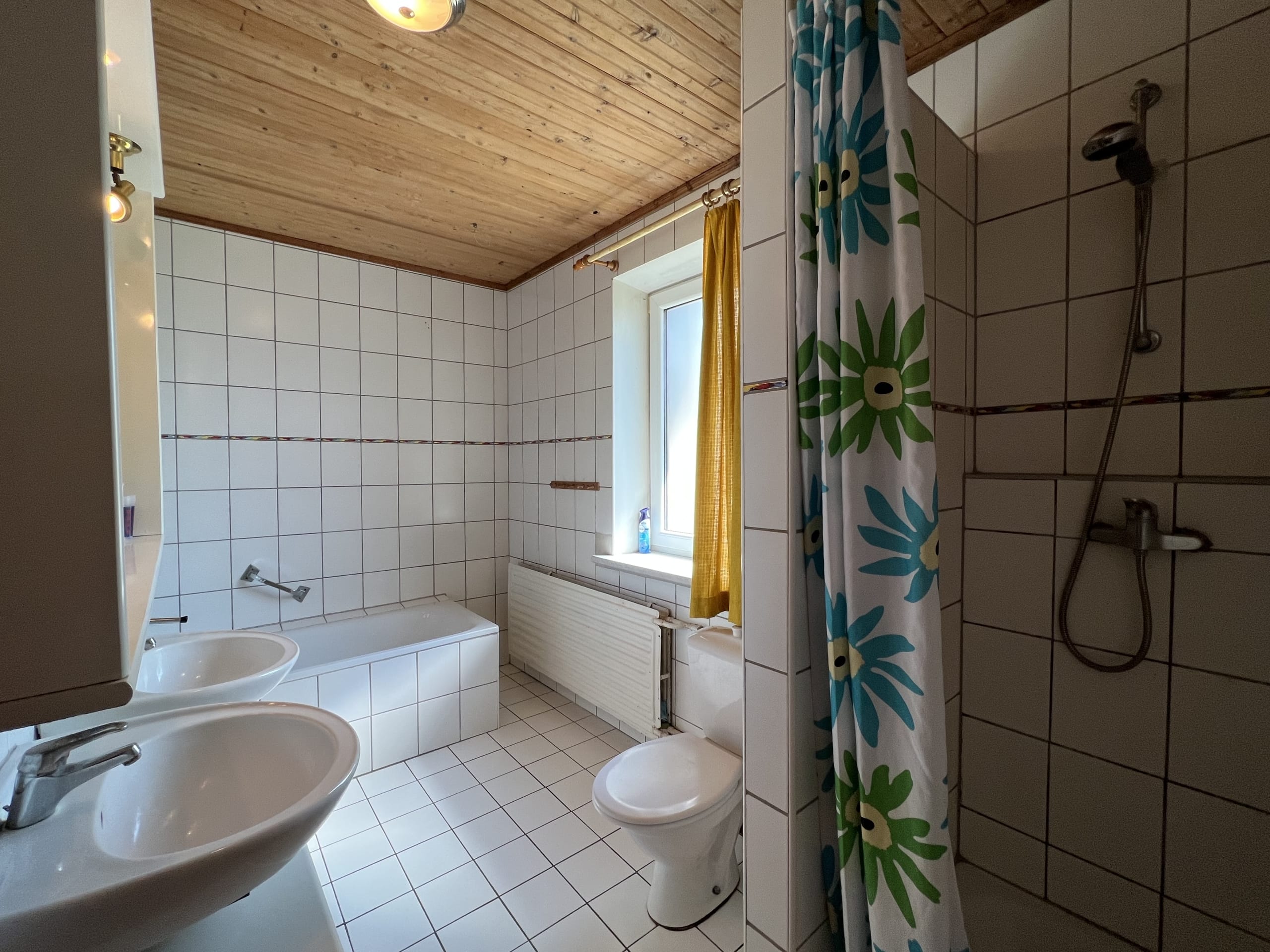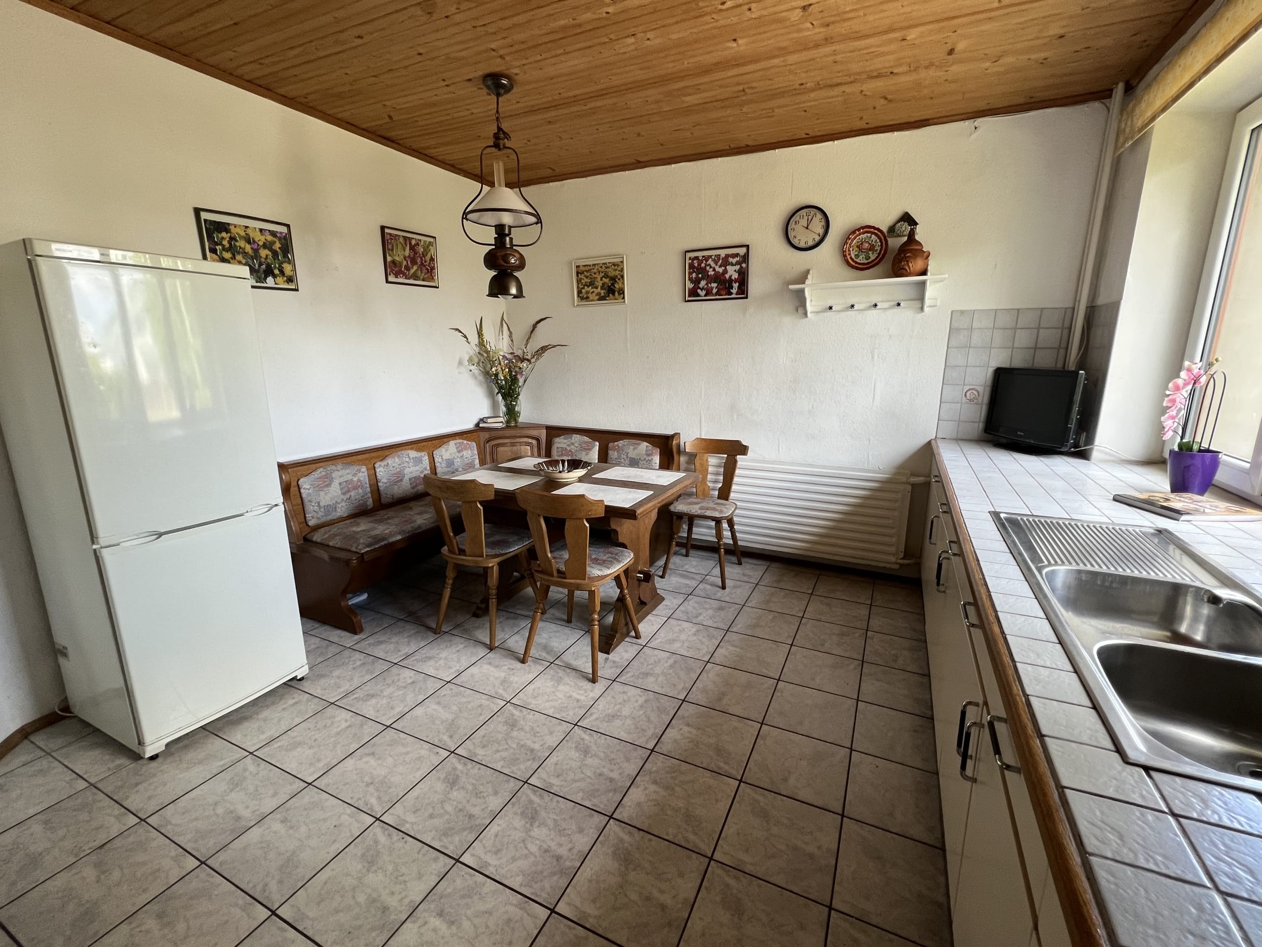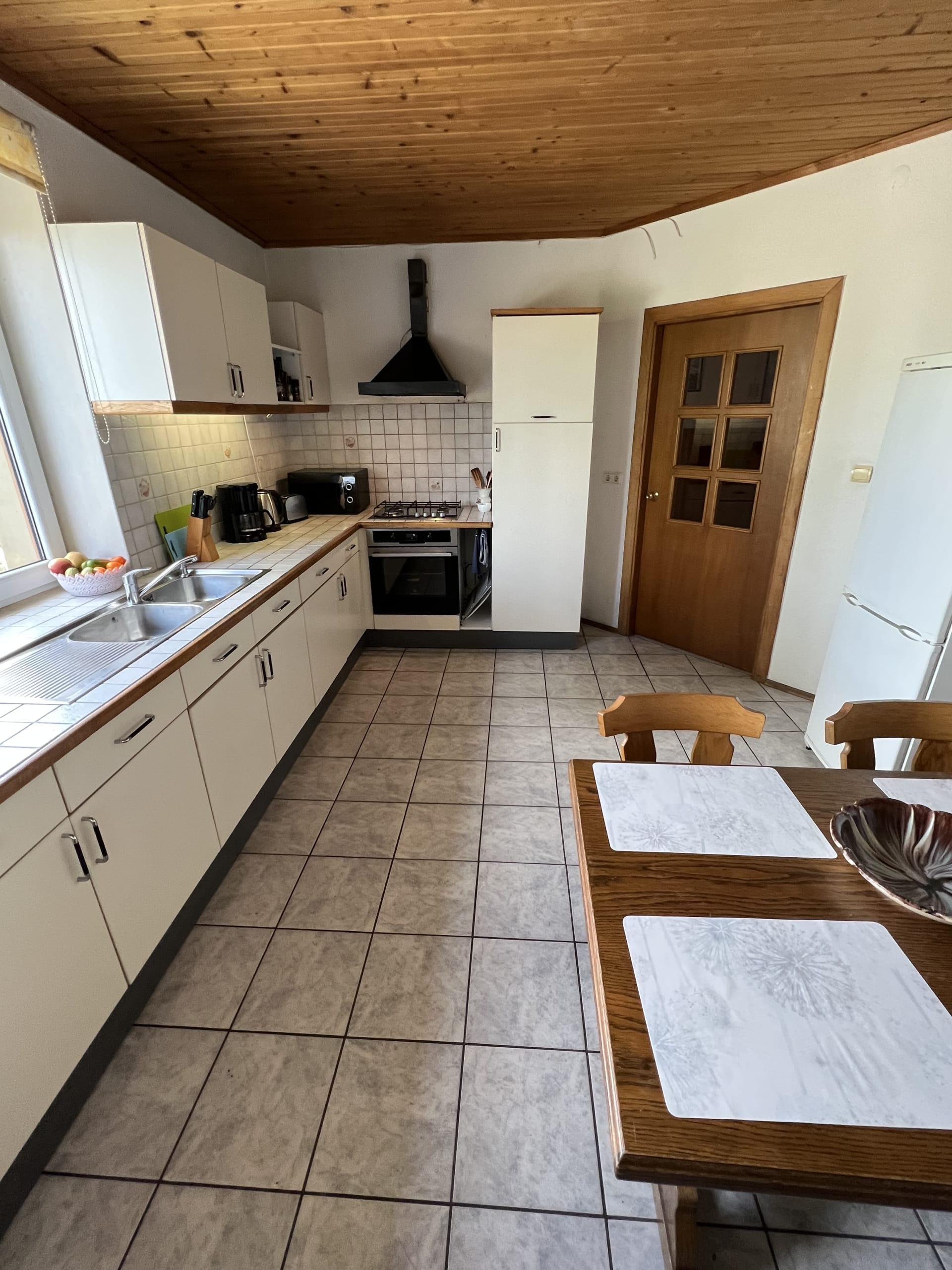 * Pirmas aukštas – virtuvėje ir vonioje su WC – plytelės, svetainėje medinės grindys ir kambariuose -kiliminė danga.